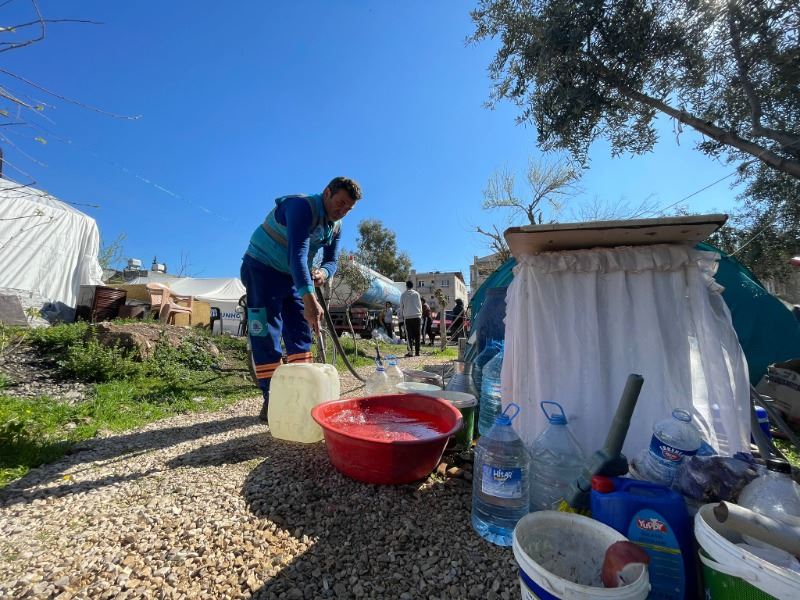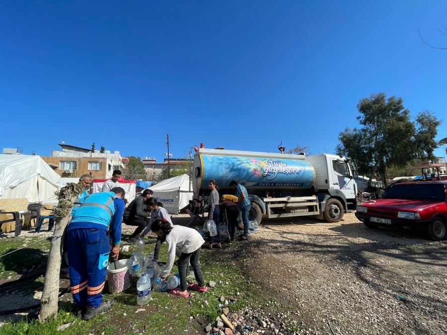 Tuzla Belediyesi ekipleri, Hatay’ın Kırıkhan ilçesinde bulunan mahallelere ve kırsal kesimlere temiz su desteğini 7 gün 24 saat esasına göre sürdürüyor. Tuzla Belediye Başkanı Dr. Şadi Yazıcı’nın öncülüğünde devam eden çalışmalarda Tuzla Belediyesi ekipleri, su tankerleri ile çadır kentlere, temiz su taşıyarak depremzedelere destek oluyorlar. Bu kapsamda ekiplerin her gün gittikleri Kırıkhan’ın Alsancak Mahallesi’nde bir arada bulunan 30 çadıra su dağıtmak için giden ekiplere, depremzedeler yöresel yemek hazırlayarak çay ikram ettiler. Hep birlikte yenilen yemeğin ardından depremzede bir kadın,” Allah devletimizden bin kere razı olsun” dedi.