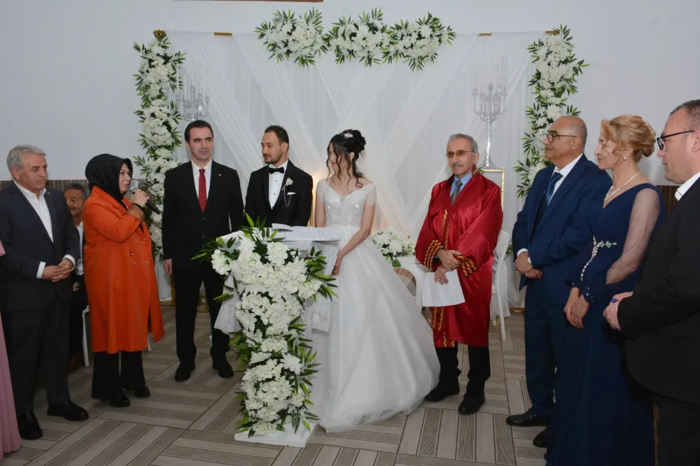 Şahitlik yapan Kaymakam Karakaya, "Allah ömür boyu mutluluklar versin. Hem genç çiftimize hem ailelerine hayırlı uğurlu olsun diyorum." dedi.
