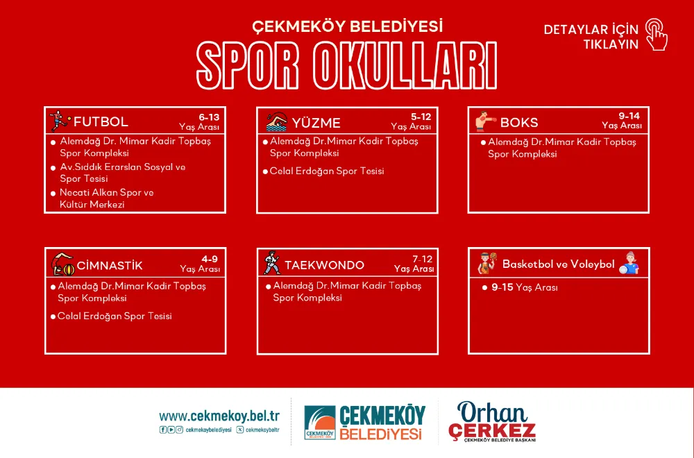 Her branşta için farklı yaş aralıklarında eğitimlerin verileceği spor okullarında; futbol branşında eğitimler 6-13 yaş aralığında ki çocuklar için; Alemdağ Dr. Kadir Topbaş Spor Kompleksi, Av. Sıddık Eraslan Sosyal ve Spor Tesisleri ve Necati Alkan Spor ve Kültür Merkezi’nde verilecek. Yüzme branşında eğitimler 5-12 yaş aralığında ki çocuklara; Alemdağ Dr. Kadir Topbaş Spor Kompleksi ve Celal Erdoğan Spor Tesisleri’nde verilecek. Cimnastik branşında eğitimler 4-9 yaş aralığında ki çocuklara Celal Erdoğan Spor Tesisleri ve Alemdağ Dr. Kadir Topbaş Spor Kompleksi’nde verilecek. Taekwondo branşında eğitimler 7-12 yaş aralığında ki çocuklara Alemdağ Dr. Kadir Topbaş Spor Kompleksi’nde verilecek. Basketbol ve voleybol branşlarında ise eğitimlerden 9-15 yaş aralığında ki çocuklar faydalanabilecek.