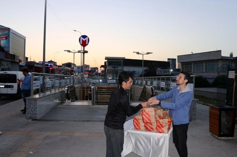 Ümraniye Belediyesi ayrıca, iftar saatinde evine yetişemeyen vatandaşlar için de metro istasyonlarının girişlerinde kumanya dağıtıyor. Vatandaşlar paket içerisinde yer alan sandviç, meyve suyu, su ve hurma ile iftarlarını açıyor.