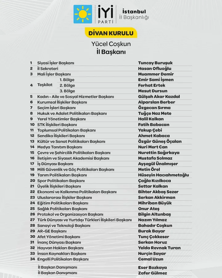 İYİ Parti İstanbul İl Başkanlığı kongreden sonra a takımını belirleyerek divan kurulunu kamuoyu ile paylaştı